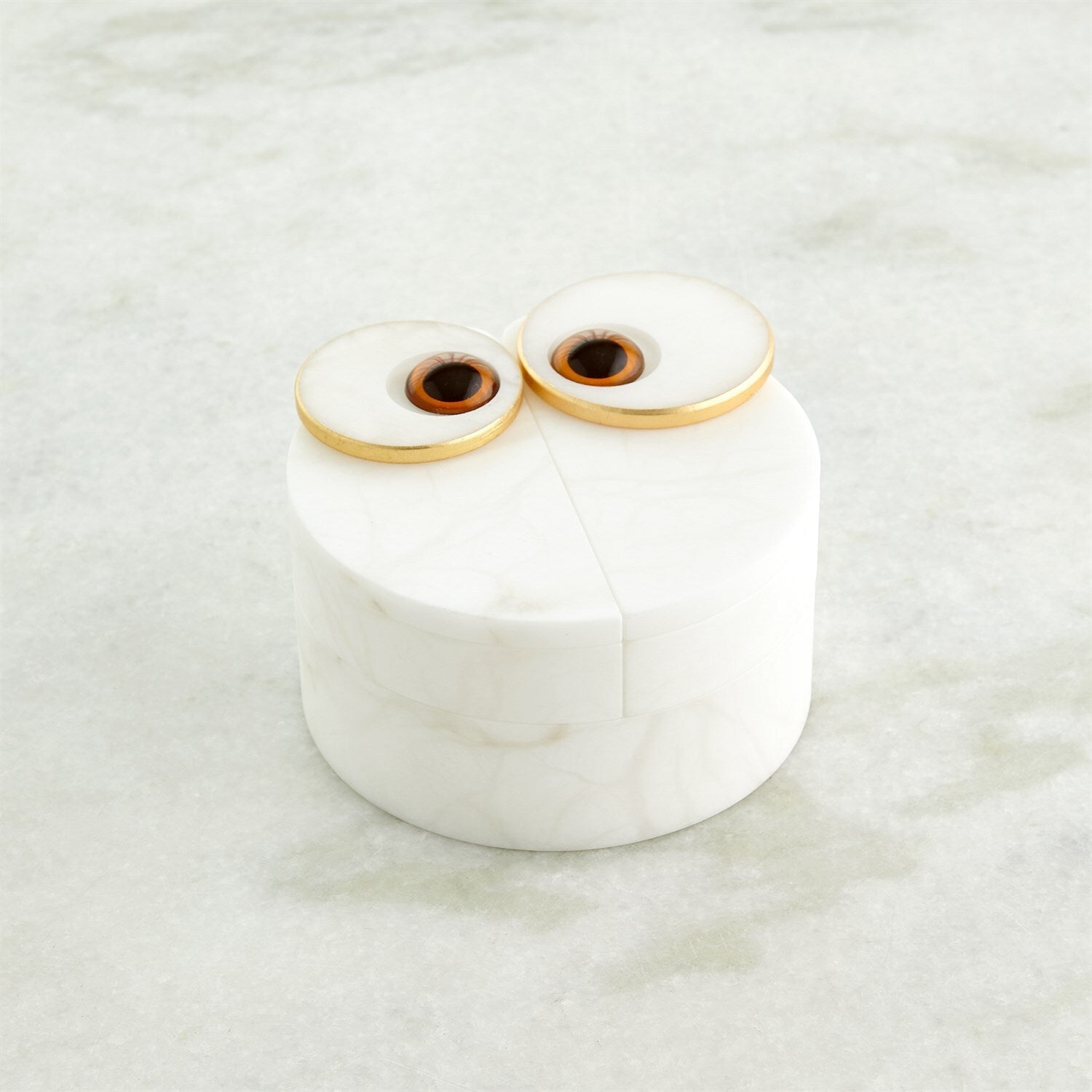 Hoos looking a you! The Owl Box is whimsically made of handcrafted Italian alabaster with gold leaf accents and glass eyes. As alabaster is a natural product, please be aware that there will always be variations in veining and color.