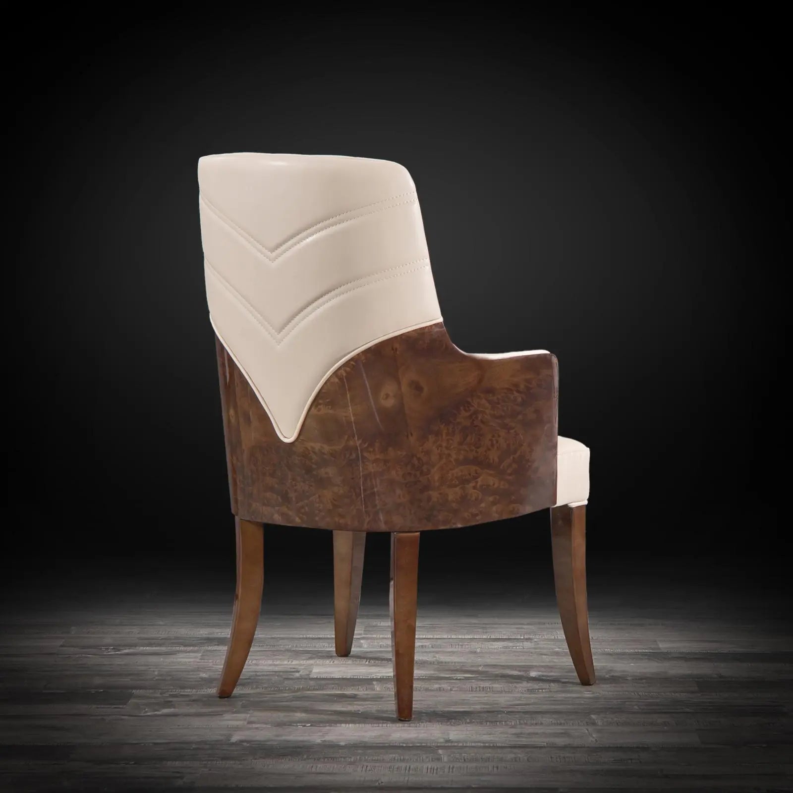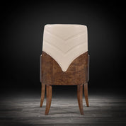 Milano dining Arm chair is upholstered in luxurious beige leather sit cushion and back with a high gloss burl veneer. The luxurious Milano arm chair has a sophisticated back upholstery detail which compliments the incredible design of the chair.